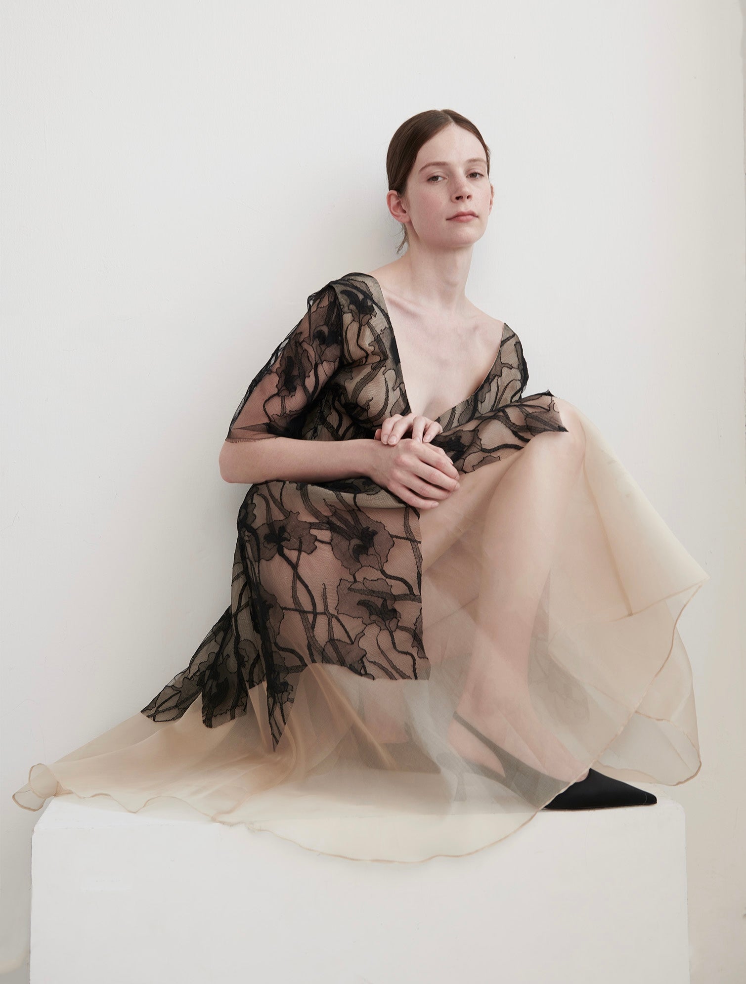 The brand’s distinctive style is characterised by its bold use of asymmetry, intricate detailing, playful cuts, combined with structured tailoring and intriguing layering.